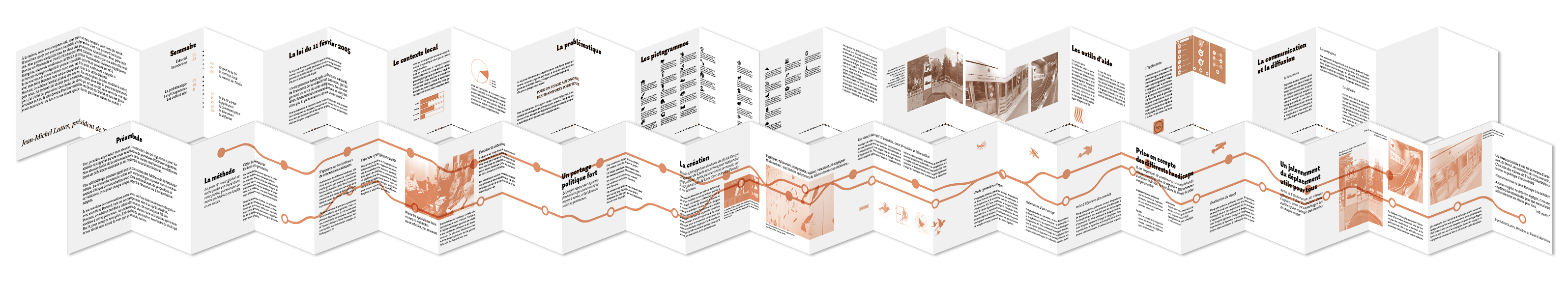 édition, institutionnelPour marquer les cinq ans de collaboration entre le DSAA des Arènes et Tisséo dans l'accessibilisation aux personnes en situation de handicap, le projet de cette année consistait à proposer une édition retraçant toute cette démarche. Ma proposition joue sur le double usage de cet objet : document de travail pour des sociétés étant inspirées par le projet, et le récit de 5 ans de collaboration.